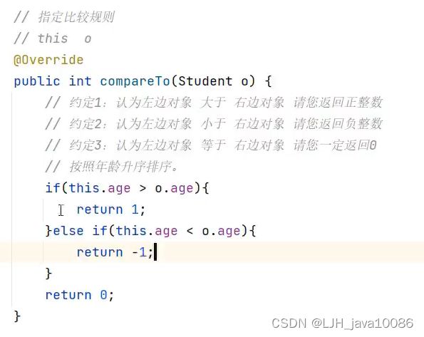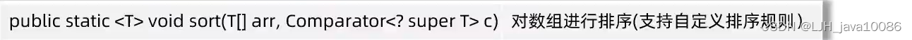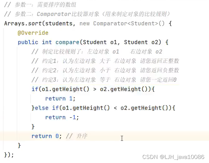 方法一:让该对象的类实现Comparable(比较规则)接口,然后重现compareTo方法,自己来制定比较规则 简化: 方法二:使用下面这个sort方法,创建Comparator比较器接口的匿名内部类对象,然后自己制定比较规则 简化: