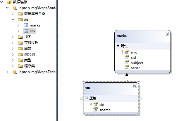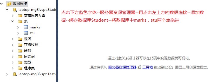 2.在建成的项目中添加LINQ to SQL类--并连接数据源--将连接的数据库Student中的marks、stu两个表拖进