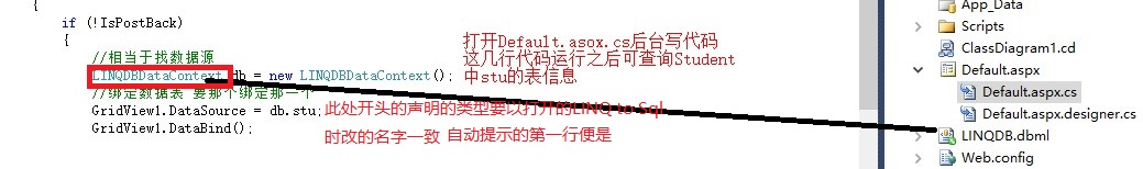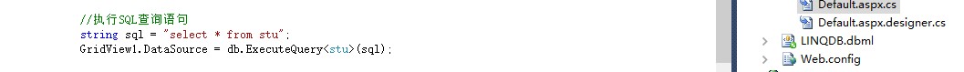 3.打开项目中的Default.aspx--在页面中拖进去GridView控件--转入后台代码编辑程序--查询数据库的表