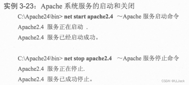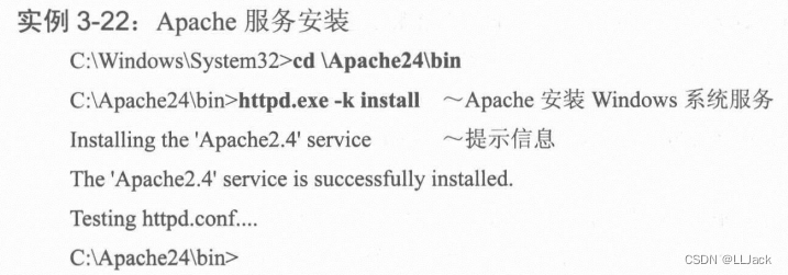 对httpd.conf文件完成修改后,以管理员身份运行cmd,安装Apache,如下图案例(这是教材中的例子,我直接截图引用了)