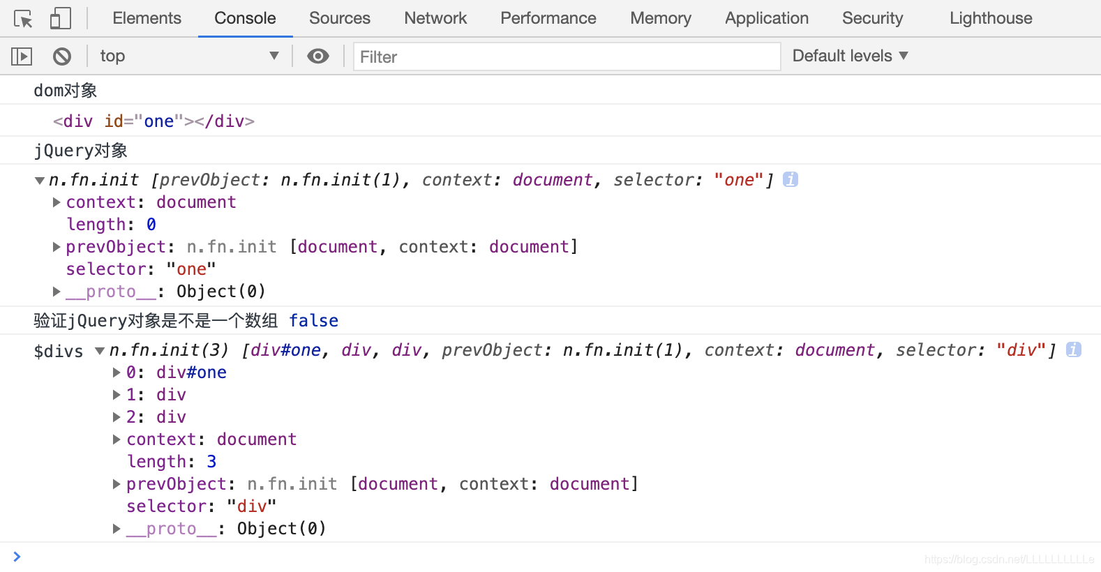 console.log("验证jQuery对象是不是一个数组", $div1.__proto__ === Array.prototype); // false, jQuery对象是一个伪数组