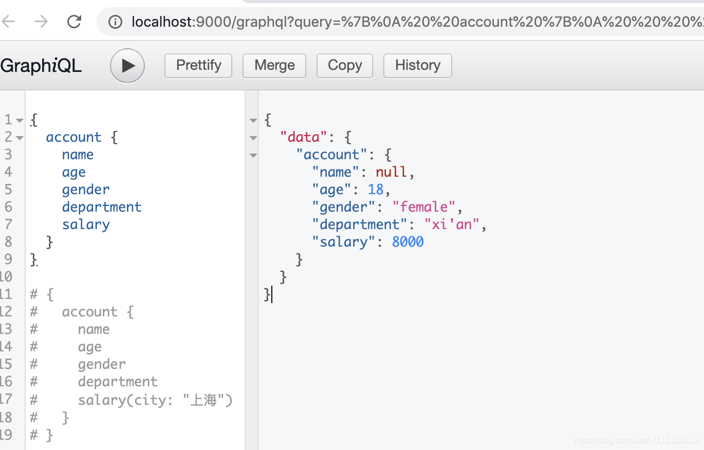 下面的例子中有一个salary,在schema中这个salary是可以传一个city的参数的,这样在对应的root里面,salary就可以被当作一个function来处理,可以在里面进行条件判断等等