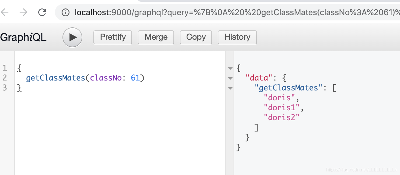 其中先在schema中定义一个getClassMates()的查询语句,加上形参,注意返回来的数据为string类型的数组。然后在root 中定义getClassMates()这个查询的解析器,其中 getClassMates({classNo}) 中的 {classNo} 其实是从arg中进行的结构赋值,当然也可以写成arg.classNo