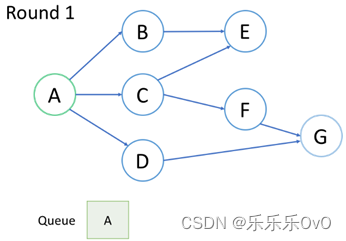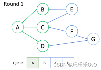 访问根节点A,并将其邻居节点B,C,D入队,访问完后A出队。