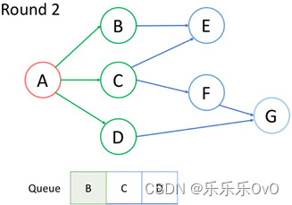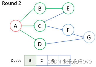 访问队列中的第一个节点B,并将其邻居节点E入队,访问完后B出队。