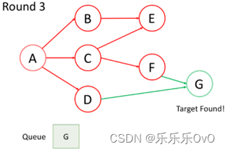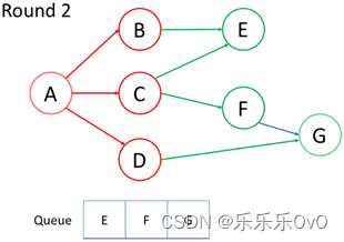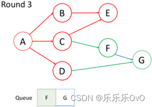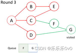 访问当前队列中的第一个节点F,不想重复访问节点,所以G未入队,访问完后F出队。最后访问节点G,队列为空,结束。