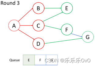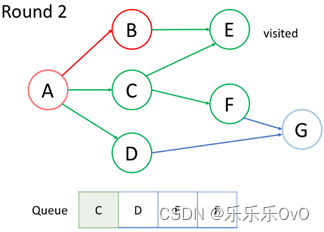访问当前队列中的第一个节点C,并将其邻居节点F入队,不想重复访问节点,所以E未入队,访问完后C出队。