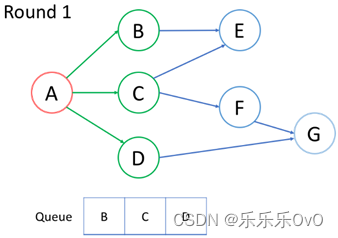 至此,A的邻居节点,也就是距离A为1的节点访问完毕,接下来访问距离A为2的节点。