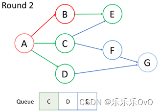 访问当前队列中的第一个节点D,并将其邻居节点G入队,访问完后D出队。
