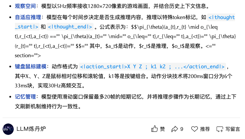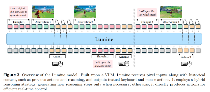 Lumine的核心思路是让智能体通过视觉输入感知环境,自适应地生成推理和动作,实现端到端的实时控制。