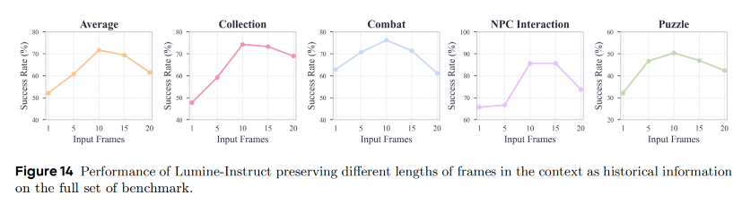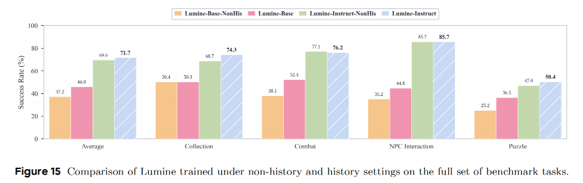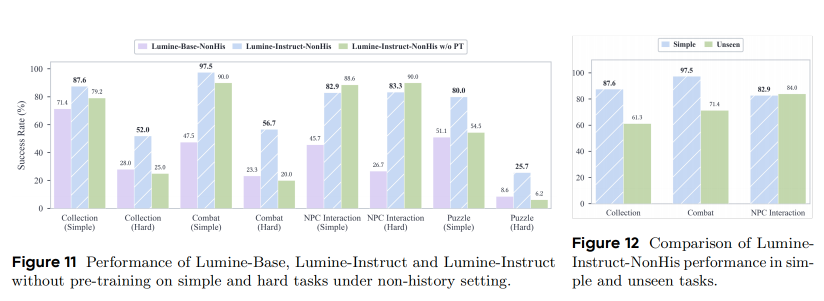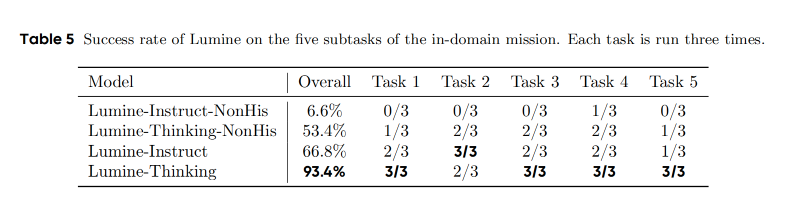 对比实验:在简单任务中,Lumine-Instruct-NonHis达到超过80%成功率,显著优于GPT-5、Gemini 2.5 Pro等基线模型(对应论文图10)。在长时任务中,Lumine-Thinking以56分钟完成《原神》第一幕,接近人类专家水平(对应表5)。