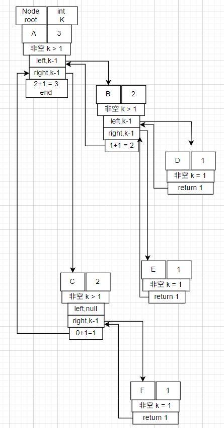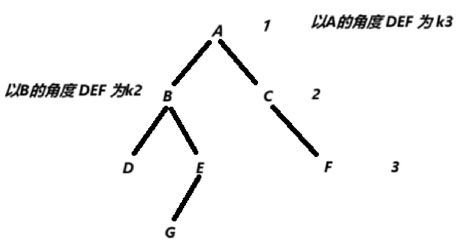 以B的视角:求 B 这个子树的k 为2的节点个数 = 求 D 这个子树的k 为1的节点个数 + E这个子树的k为1的节点个数