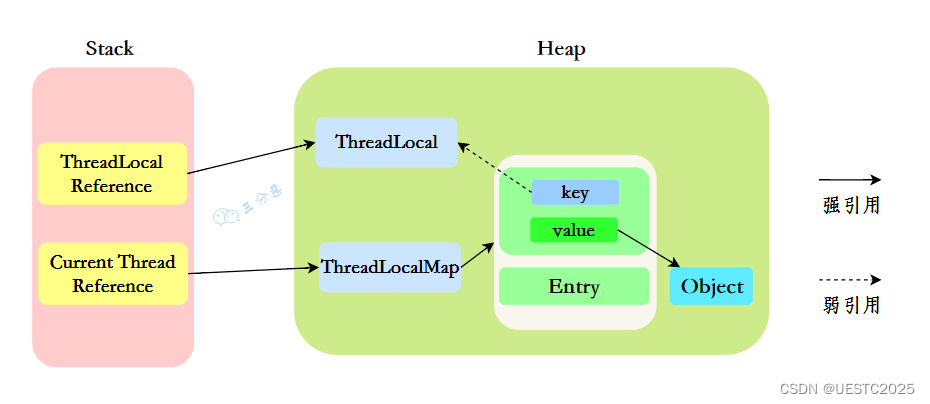 4、栈存储Thread和ThreadLocal的引用,堆存储他们的示例值。