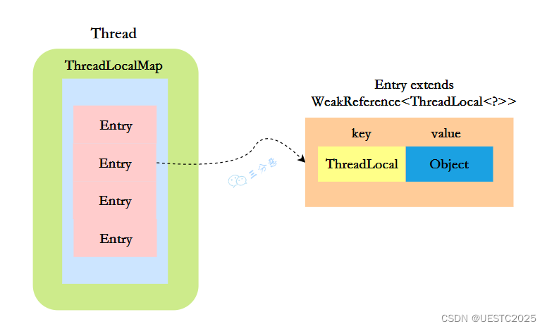 2、ThreadLocalMap内部维护着Entry数组,每个Entry是一个完整的对象,key是ThreadLocal 的弱引用,value是ThreadLocal的泛型值。