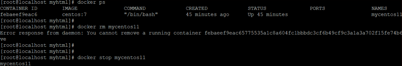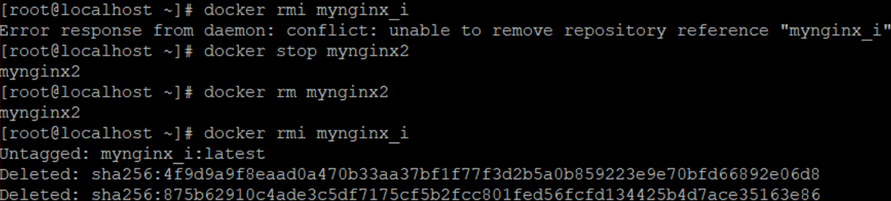 我们需要直接恢复刚刚的 tar 文件 ,就需要先删除 mynginx_i 镜像,才能恢复, 直接删除 mynginx_i 镜像 ,发现会报错,因为当前镜像的容器正在运行,需要先停止容器,删除容器 , 在删除镜像