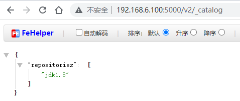 (3)打开浏览器 输入地址 http://192.168.6.100:5000/v2/_catalog 看到{“repositories”:[]} 表示私有仓库搭建成功并且内容为空