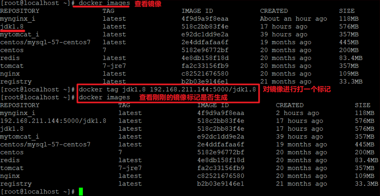 # docker tag jdk1.8 宿主机IP:5000/jdk1.8