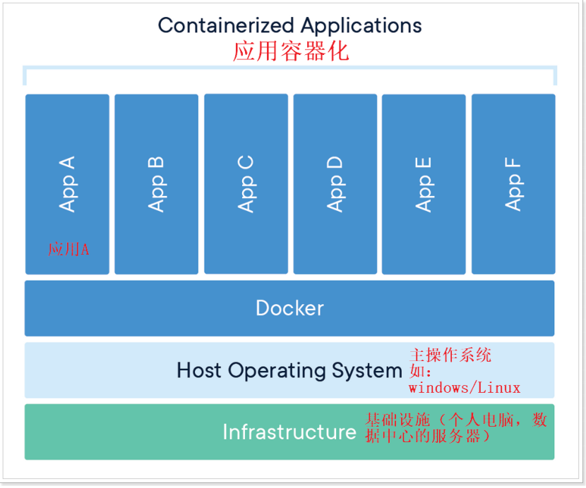 传统虚拟机技术基于安装在主操作系统上的虚拟机管理系统(如:VirtualBox和VMWare等),创建虚拟机(虚拟出各种硬件),在虚拟机上安装从操作系统,在从操作系统中安装部署各种应用。