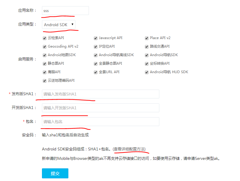进入 应用名称自己填 应用类型 选Android SDK 包名为项目包名 SHA1点击查看详细配置方法