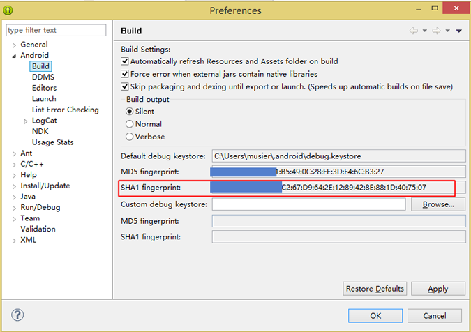 如果使用adt 22,可以在eclipse中直接查看:windows -> preferance -> android -> build。 如下图示: