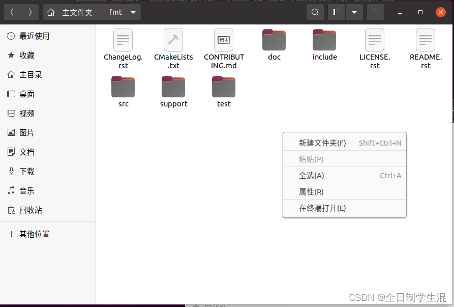 下载下来后解压(我解压后的文件夹名是fmt),然后进入文件夹,在空白处右键,选择“在终端打开”