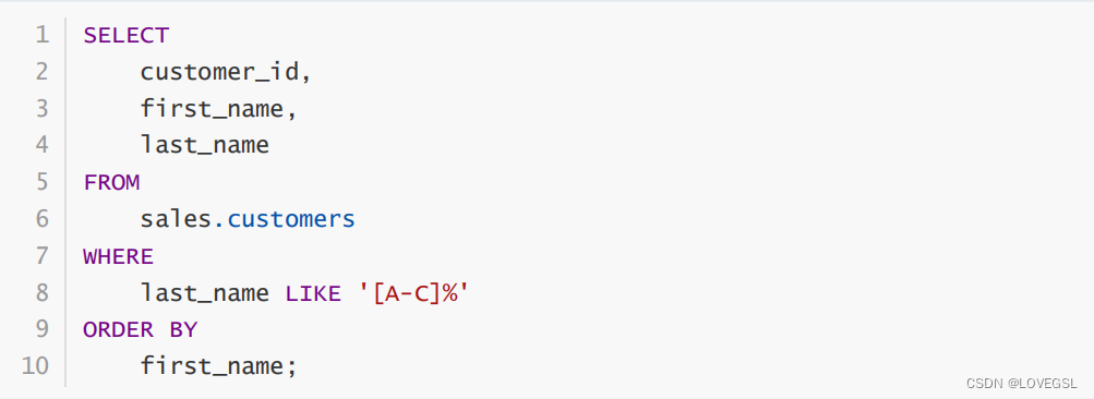 例如,以下查询查找客户,其中姓氏中的第一个字符是范围 A 到 C 中的字母: