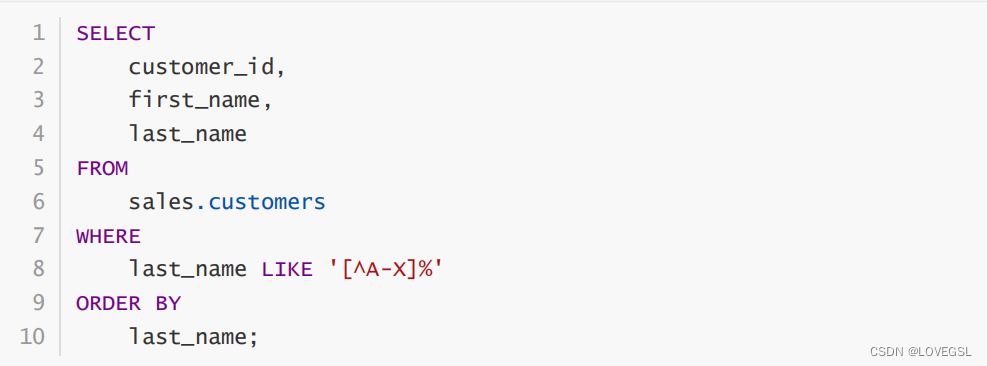 例如,以下查询返回姓氏中的第一个字符不是范围A到X中的字母的客户信息: