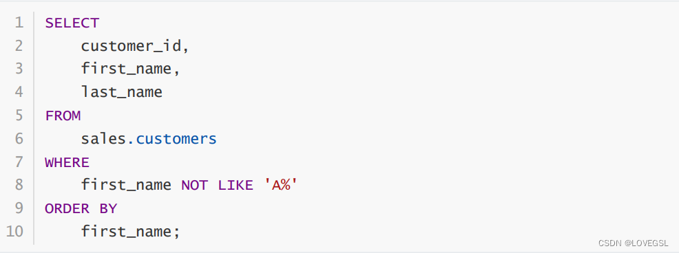 以下示例使用 NOT LIKE 运算符查找名字中第一个字符不是字母 A 的客户: