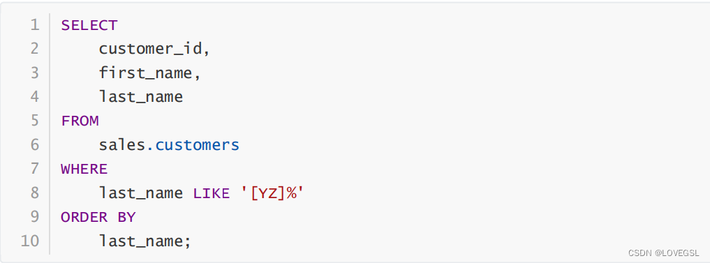 例如,以下查询返回姓氏(last_name)中第一个字符为 Y 或 Z 的客户: