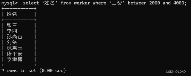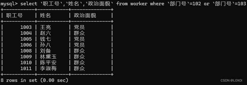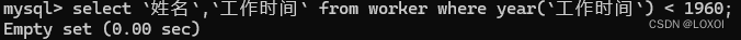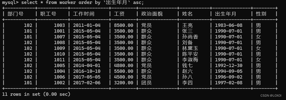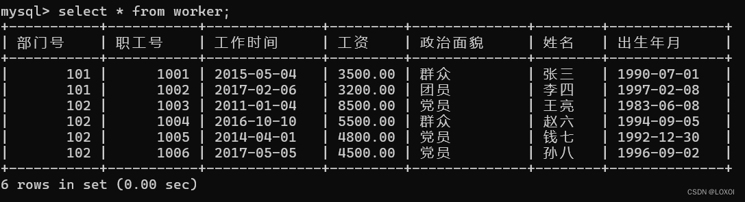 一、单表查询 素材: 表名:worker-- 表中字段均为中文,比如 部门号 工资 职工号 参加工作 等