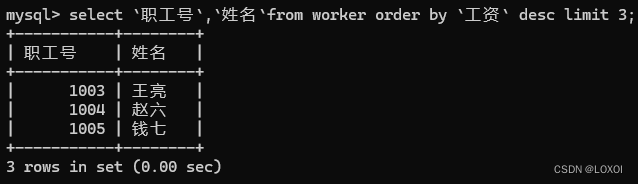 select `职工号`,`姓名`from worker order by `工资` desc limit 3;