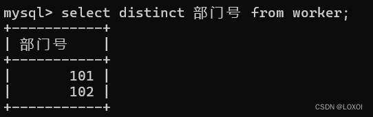 2、查询所有职工所属部门的部门号,不显示重复的部门号。