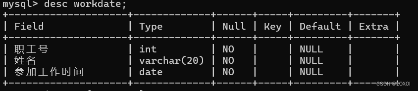 create table workdate (职工号 int(11) NOT NULL, 姓名 varchar (20) NOT NULL, 参加工作时间 date NOT NULL);