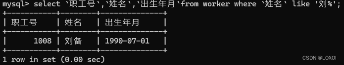 select `职工号`,`姓名`,`出生年月`from worker where `姓名` like '刘%';