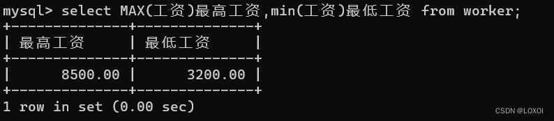 select MAX(工资)最高工资,min(工资)最低工资 from worker;