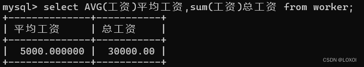 select AVG(工资)平均工资,sum(工资)总工资 from worker;