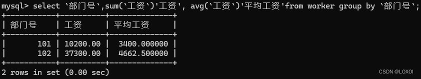 select `部门号`,sum(`工资`)'工资', avg(`工资`)'平均工资'from worker group by `部门号`;