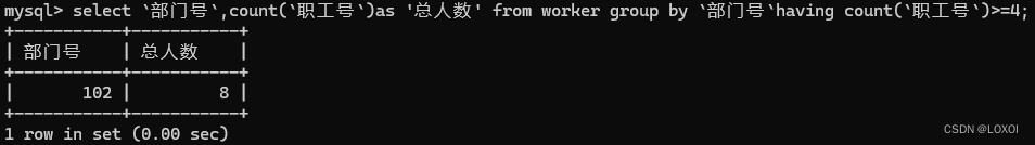 select `部门号`,count(`职工号`)as '总人数' from worker group by `部门号`having count(`职工号`)>=4;