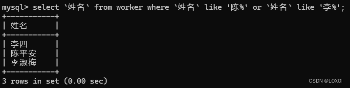 select `姓名` from worker where `姓名` like '陈%' or `姓名` like '李%';