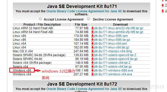 根据运行平台类型下载对应的位数的JDK,我当前电脑是windows 32位操作系统的,我们就下载32位的: