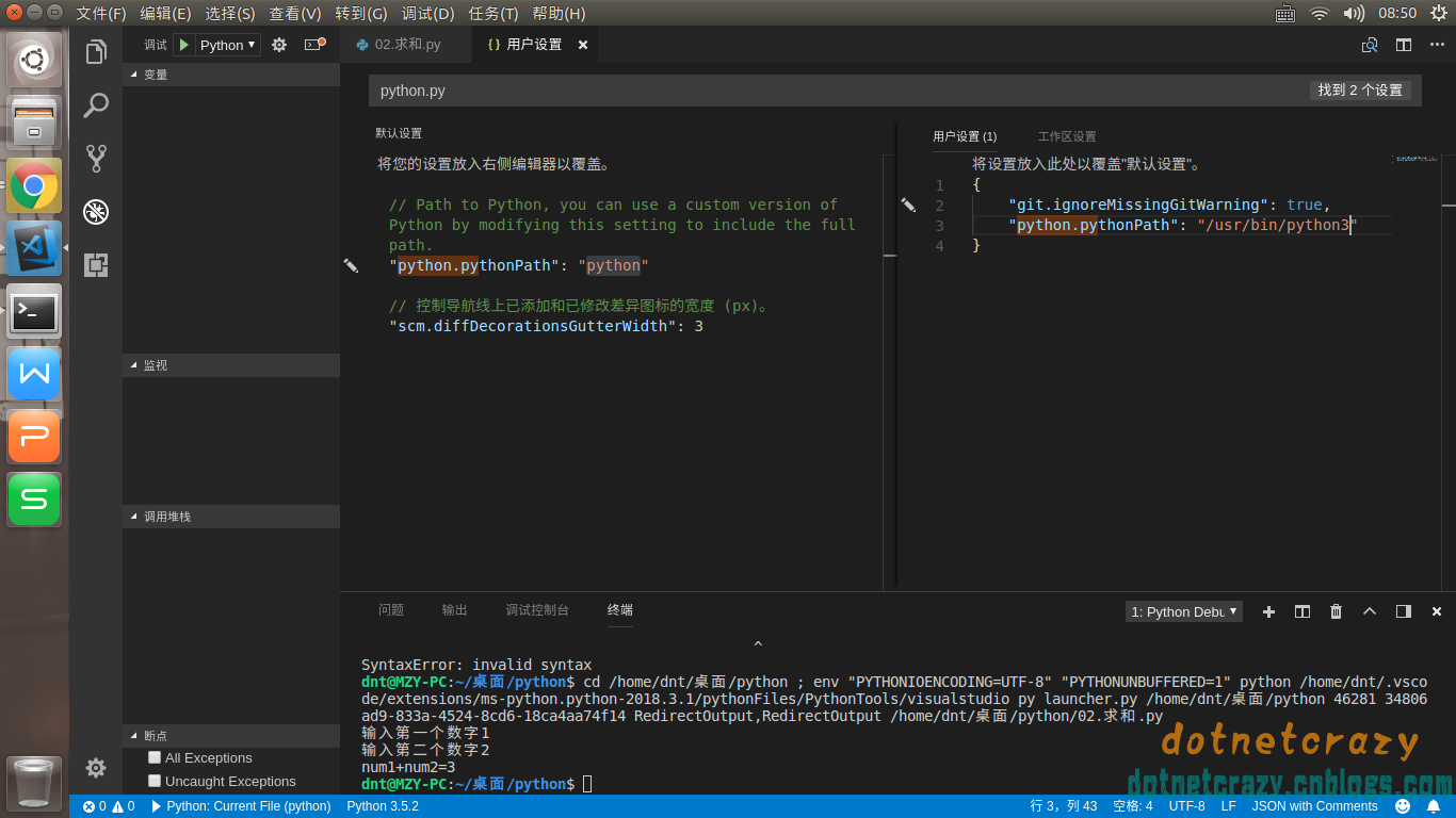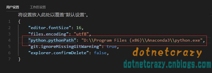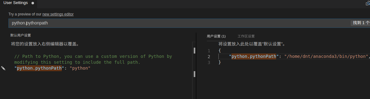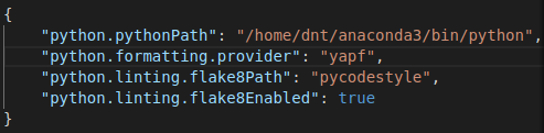 // 设置Python的路径 "python.pythonPath": "python3.7", // "python.pythonPath": "/home/dnt/anaconda3/bin/python", // 设置Python的代码格式化 "python.formatting.provider": "yapf", // 设置Python的代码检查 "python.linting.flake8Path": "pycodestyle", "python.linting.flake8Enabled": true,