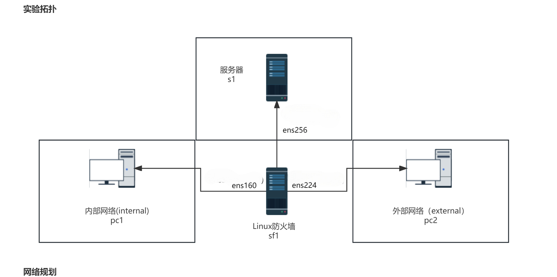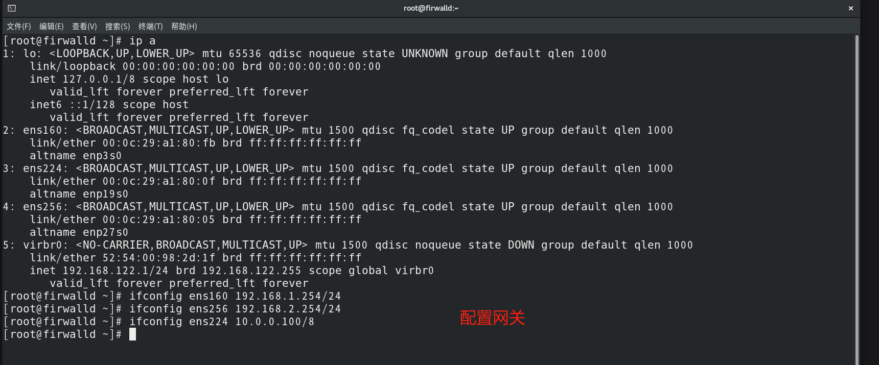 Linux防火墙的三块网卡为别连接不同的网络区域,地址分别为 :ens160 192.168.1.254/24;ens224 10.0.0.100/8;ens256 192.168.2.254/24