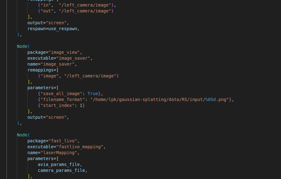 由于一开始并未在 /fast_ws/src/fast_livo/Log/Clomap 中创建 images 文件夹,导致在运行launch文件时并不会同步保存图像,launch文件完成后 /Colmap 下只有 /sparse 一个文件夹,于是本人便在launch文件中添加节点用于保存图像,同时打开 sparse 文件里的 image.txt 文件,查看图片编号,删掉图像文件夹里面的多余图片,使图片能和 image.txt 文件里的编号一一对应。