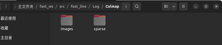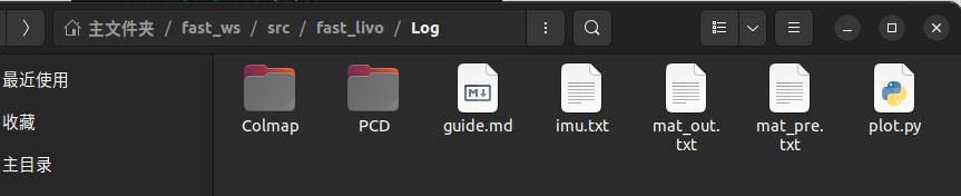 进入 /fast_ws/src/fast_livo/Log文件夹里,若无PCD或者Colmap文件夹,需要提前创建,进入Colmap,检查是否有 images 和 sparse 文件夹,若无需要提前创建,否则运行launch文件时无法同步保存图片与点云信息