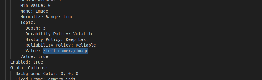 (2)同时,在 /fast_ws/src/fast_livo/rviz_cfg 文件夹中找到 fast_livo2.rviz 文件,找到 Image 的话题订阅,将 Value 改为 /left_camera/image ,使其在自动打开rviz时就能接收到图像数据,在rviz的左下方就能同步看到画面