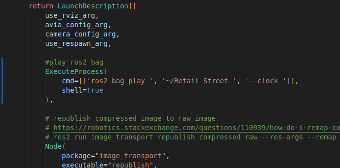 找到 mapping_avia.launch.py 这个文件,首先launch文件里找到#play ros2 bag部分,修改成如下样式:(把原来的"-l"去掉不让循环播放,播完一次包就自动暂停)