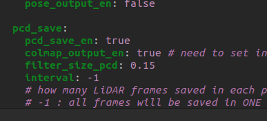 在 /fast_ws/src/fast_livo/config 里找到 avia.yaml 文件,找到下面内容把 false 改成 true ,后续在运行launch文件时会自动保存点云文件到 fast_livo/log 文件夹里