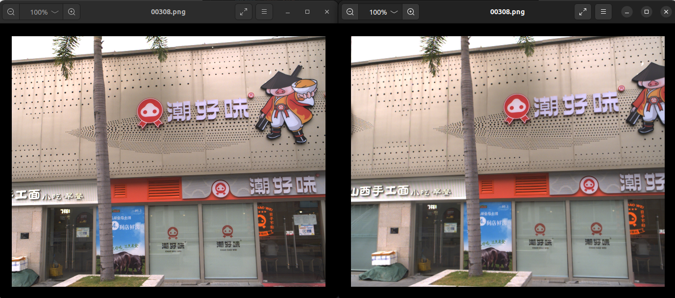 这样做貌似没啥问题,图片也能正常保存,/sparse 文件夹的点云数据也能正常获取,但其实问题很大,点云数据与照片的保存并非同步,导致后续训练高斯点云出来的画面极差!找了很久的原因,最后发现就是这个问题,这种新建节点保存图像的方式并不可取,对比同一编号的照片,左边是通过新建节点保存的,右边是通过创建images文件夹同步保存的,明显发现两者视角上存在差异,点云与图像是并不匹配的