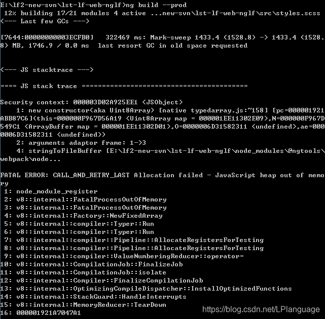 使用angular进行编译打包(命令: ng build --prod)时,进度条到12%是会出现以下错误提示,大致意思就是node的内存分配不足,如下图所示: