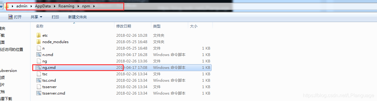第一步:首先找到系统下npm的安装目录,一般情况下可能会在C:\Users\admin\AppData\Roaming\npm目录下,找到ng.cmd文件,如下图所示: